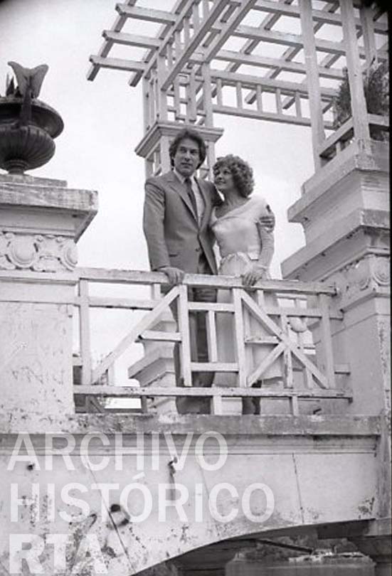Foto 21/05/1980 Serie: Firma contrato Arnaldo André. 1ra grabación exteriores. Beatriz Taibo y Arnaldo André en plena grabación de la telenovela Fabián 2- Mariana 0, bajando del puente griego ubicado en El Rosedal en la ciudad de Buenos Aires.